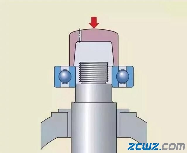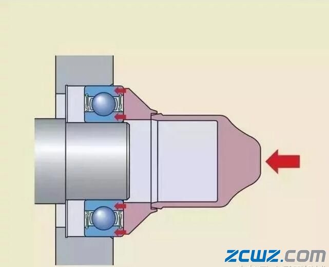 安装内圈过盈配合的轴承时,不能通过外圈和滚动体把力传递给内圈。这会把轴承滚道和滚动体表面敲坏,使轴承在运转时产生噪音并提前损坏。正确的方法应该用套筒直接把力作用在内圈端面上