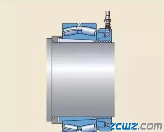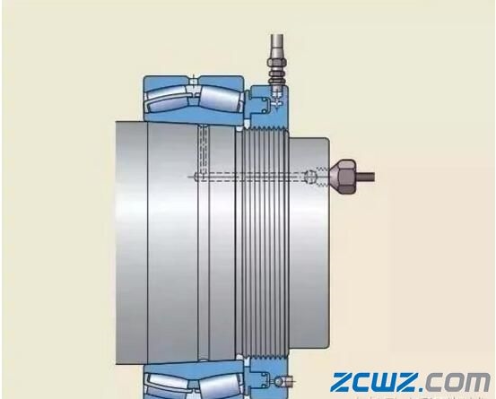 注油法的工作原理是:液压油在高压下通过油孔和油槽,注入轴承和轴径之间的配合面,形成一层油膜。油膜将配合面分开,使得配合面之间的摩擦大幅减少。这种方法通常用于直接把轴承安装在圆锥形轴径上的情况。必须的油孔和油槽应是整体轴设计的一部分。如果紧定套和退卸套,已加工有油孔油槽,这种方法也可用于将轴承安装在紧定套或退卸套上。