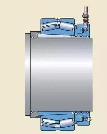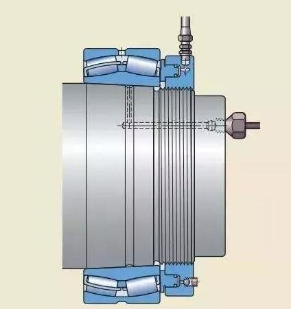这种方法通常用于直接把轴承安装在圆锥形轴径上的情况。必须的油孔和油槽应是整体轴设计的一部分。如果紧定套和退卸套,已加工有油孔油槽,这种方法也可用于将轴承安装在紧定套或退卸套上。