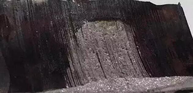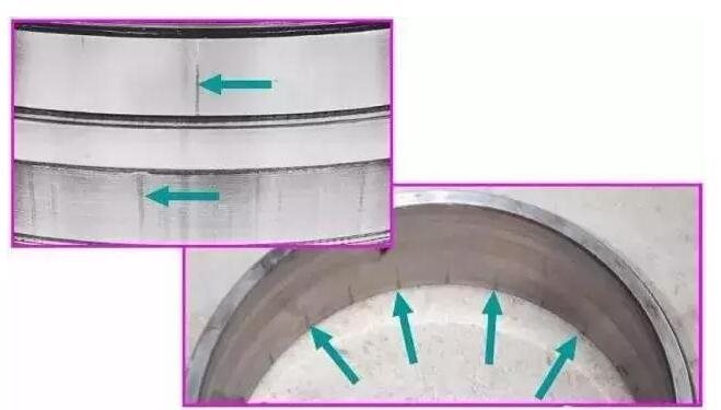 当“走内圈”时,内圈与轴之间的滑动摩擦将产生高温,由于内圈端面与轴肩接触面很小,其温度会更高。使内圈端面产生热裂纹,热裂纹的不断延伸,将使轴承内圈在使用中断裂。