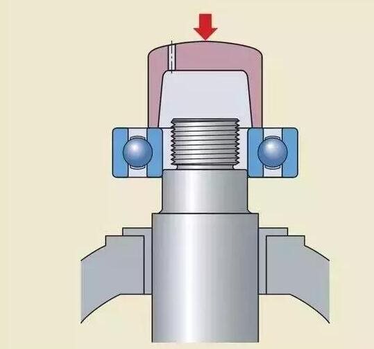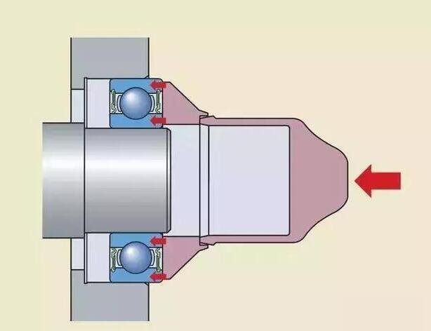 安装内圈过盈配合的轴承时,不能通过外圈和滚动体把力传递给内圈。这会把轴承滚道和滚动体表面敲坏,使轴承在运转时产生噪音并提前损坏。正确的方法应该用套筒直接把力作用在内圈端面上。