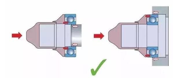 大部分轴承都采用压入法进行安装。如果要将轴承的内外圈同时装到轴上和轴承座中,必须确保以相同的压力同时作用在内外圈上,且必须与安装工具接触面在同一平面上。