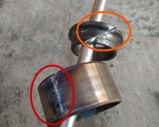 汽修师傅用了一个多小时,才把卡在轴头上的内圆以及卡在转向节内的外圆给敲出来!下图红色区域所示的是轴承外圆,我们可以看出它上面的痕迹!橙色区域所示是卡在轴头上的轴承内圆,切割机的痕迹!