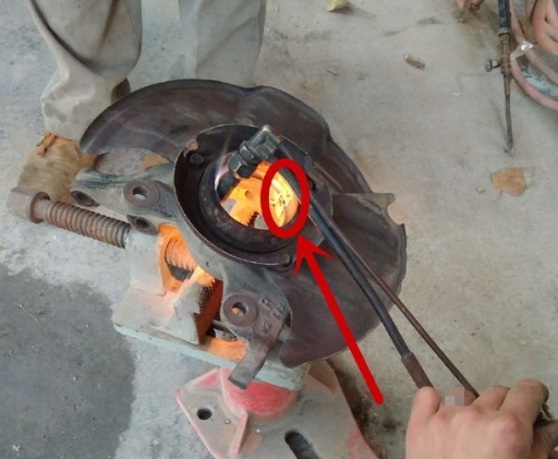 下图箭头所示,汽修师傅把轴承内圆切割后,开始用锤和截子来把轴承外圆砸下来!要注意的是,一定不能把转向节内部给损坏,这就需要老师傅来做这个工作!