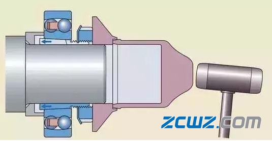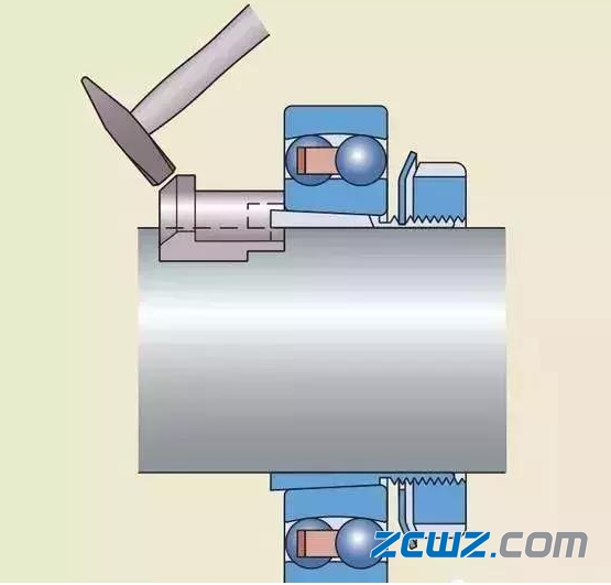 对安装于紧定套配阶梯轴上的小型轴承,可以使用锤子通过一个特制的套筒敲击紧定套锁紧螺母的小端面来拆卸(图2)。在此之前,需要将紧定套锁紧螺母拧松数圈。