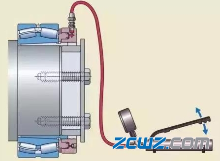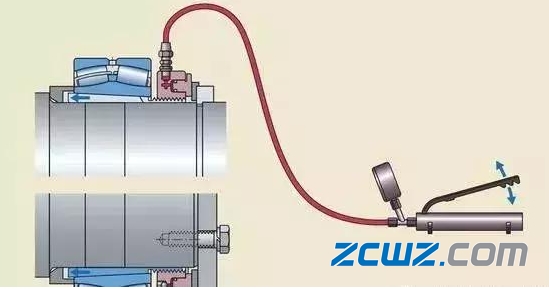 对于安装在紧定套配阶梯轴上的轴承,使用液压螺母可使轴承拆卸更简便。为此必须在紧靠液压螺母活塞的位置安装合适的止动装置(图3),注油法是更简易的方法,但必须使用带有油孔和油槽的紧定套。