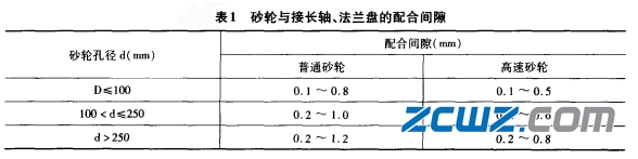 (2)砂轮内孔与接长轴、法兰盘等的配合,应有适当的间隙(表1),以免磨削时受热膨胀而使砂轮胀裂。如果由于砂轮孔径太小而使配合过紧时,绝对不允许用力把它压进去,而必须把孔径扩大后再安装,以免砂轮因预受过大胀力而在工作时碎裂。但配合间隙也不能过大,否则砂轮容易发生偏心,而失掉平衡,使砂轮主轴发生振动,不仅影响加工表面粗糙度,而且还可能造成砂轮破裂。如果发现间隙过大,可在接长轴、法兰盘等的配合面上均匀地包上一层薄纸片。