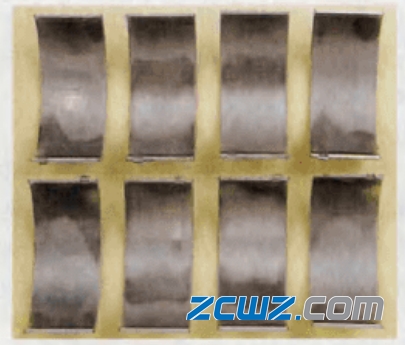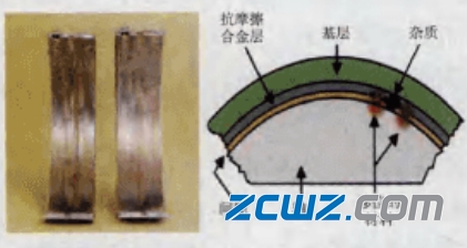 原因:轴瓦内腔及背面有杂质,导致接触面不充分并减弱了热量传递。这些区域的热量和局部载荷使轴瓦疲劳强度上升,导致轴瓦材料分离。