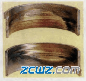 原因:由于轴瓦安装不正确,例如曲轴压在轴瓦边缘,导致轴瓦在轴向上间隙不足。从某种程度上说,引起了摩擦和润滑油膜缺乏,导致温度上升,直到铅从铜合金层上分离,这些区域完全被损坏。