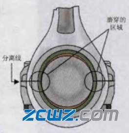 原因:在将轴瓦装入连杆内腔时,两片轴瓦分隔区域表面有凸出。当拧紧连杆螺栓时,轴瓦凸出的部分将压在曲轴表面上,从而产生很 大的径向接触压力。图9展示了因轴瓦高度过高,产生的径向接触压力使两片轴瓦分隔区域变形。轴瓦分隔表面重新加工过,或连杆螺栓紧固力矩过大是造成这种现象的最常见原因。