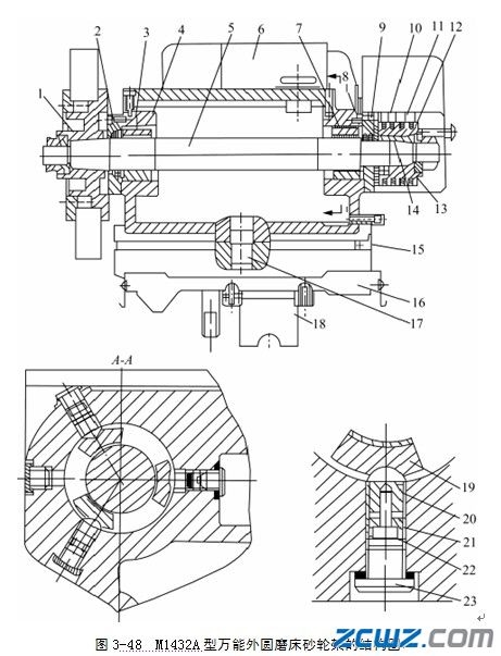 1432A万能外圆磨床内圆磨具主轴部件结构。由于磨削内圆时砂轮直径较小,所以内圆磨具主轴应具有很高的转速,内圆磨具应保证高转速下运动平稳,并且主轴轴承应具有足够的刚度和寿命。内圆磨具主轴由平带传动。主轴前、后支承各用两个D级精度的角接触球轴承,均匀分布的8个弹簧3的作用力通过套筒2、4顶紧轴承外圈。当轴承磨损产生间隙或主轴受热膨胀时,由弹簧自动补偿调整,从而保证了主轴轴承刚度和稳定的预紧力。