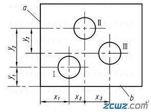 在坐标镗床上按坐标法镗孔,是将各孔间的尺寸转化为直角坐标尺寸,如图所示。
