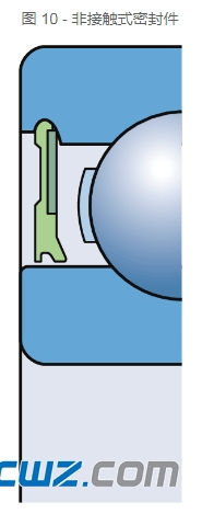 带密封件的轴承是中度污染配置的首选。 在无法排除水分和湿气的情况下,通常采用接触式密封件(图 8)。 这些密封件与其中一个轴承套圈的滑动表面形成主动接触。 低摩擦密封件(图 9)和非接触式密封件(图 10)可承受与带防尘盖的轴承相同的速度,但密封效能有所改进。