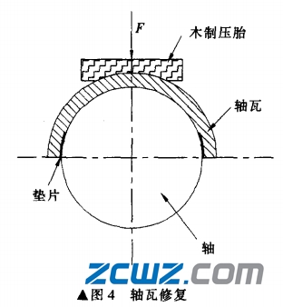 首先将轴瓦安装到轴上,在轴瓦的顶面加方木,并且根据材质和变形大小加垫片厚度。逐步加载油压机的压力,卸载后拆落工件,检查瓦口直径大小,根据实测结果确实是否需要再次校形。