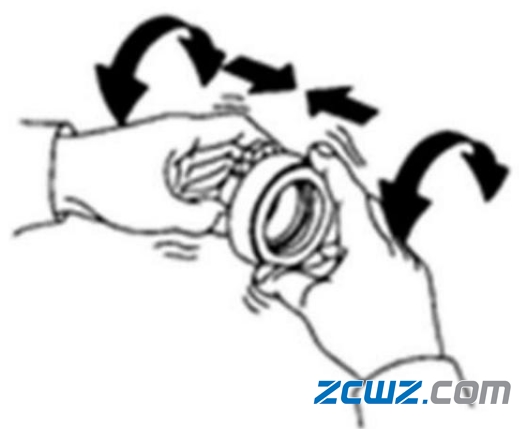 用手固定分离轴承内圈,转动外圈,同时在轴向加压力,如有阻滞或有明显间隙感时,应更换分离承。分离轴承通常是一次性加注润滑脂。维护时切随意拆卸清洗。若有脏污,可用干净抹布擦净表面。如图所示。