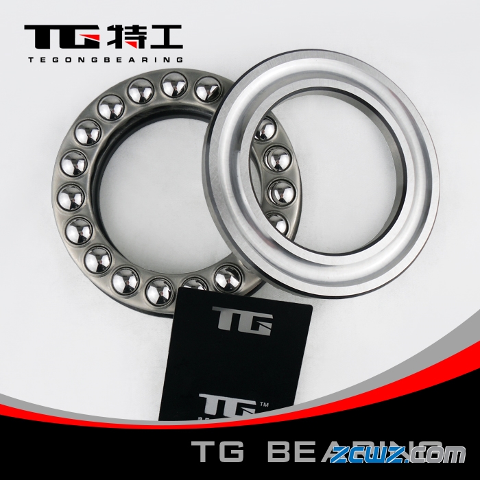推力球轴承的套圈与滚动体多半是可分离的,接触角为90度。有单向和双向之分。单向推力球轴承只能承受单向轴向载荷,限制轴和外壳一个方向的轴向移动,两个套圈的内孔不一样大,内径较小的是紧圈(轴圈),与轴配合,内孔较大的是松圈(座圈),与机座固定在一起。极限转速较低,适用于轴向力大而转速较低的场合。双向推力球轴承可承受双向轴向载荷,可以限制轴和外壳两个方向的移动,中间套圈为紧圈,与轴配合,另两套圈为松圈。高速时,由于离心力大,球与保持架因摩擦而发热严重,寿命较低。常用于轴向载荷大、转速不高处。