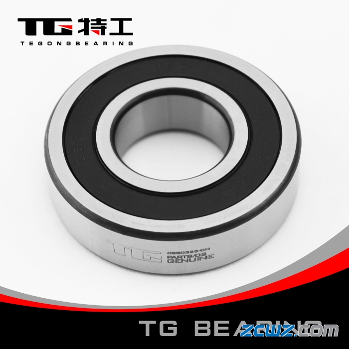 ③带密封圈深沟球轴承,有一面带密封圈和两面带密封圈两种,一般采用钢骨架式丁晴橡胶密封圈,密封唇与内圈挡边径向接触,为接触式密封,密封效果较好,但摩擦阻力较大,极限转速较低,如果密封唇与内圈挡边不接触,则为非接触式密封,其极限转速与基本型深沟球轴承相同,如6203—2RZ,6203—2RS。