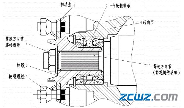统通过螺栓相连接。在汽车行驶时,带花键传动轴的等速万向节7轮毂轴承法兰盘3、二代轮毂轴承单元内圈、制动盘4以及轮辋旋转,而轮毂轴承外圈6与转向节通过悬架系统保持静止。