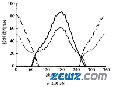 因此,当内、外圈上螺栓预紧力存在差异时,上、下滚道接触载荷分布规律变化不大,但其差异较大,且外圈预紧力小于内圈预紧力时最大。上、下滚道接触载荷差异较大,造成上,下滚道寿命差异较大,从而使轴承整体寿命降低,并尽量减小内、外圈预紧力差异。