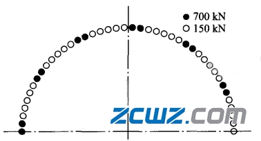 在实际中,常用控制螺栓预紧力的方法均会产生预紧力误差,例如感觉法最大误差可达40%。预紧力误差将导致整个轴承上螺栓预紧力分布不均。为了研究螺栓预紧力分布不均对轴承工作状态下载荷分布的影响,选择如图4所示螺栓预紧力分布(“●”处螺栓预紧力为700kN,“O”处螺栓预紧力为150kN)。对应滚珠-滚道接触载荷分布如图5所示。