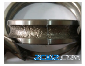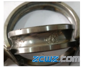 (2)由于轴承使用不当,使轴承内圈受非正常的轴向力,导致轴承内、外圈间游隙变小,内圈发生偏沟磨损,直至发生剥落。可见,轴承在选型时要根据实际工作情况进行合理选择,如有特殊要求应及时与生产厂家协调,从而确保轴承的使用精度和使用寿命。