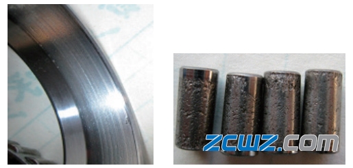 图5外圈滚道点蚀现象和滚子滚道表面剥落