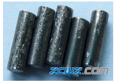 对失效的滚针轴承拆套进行宏观形貌观察。此滚针轴承外径面局部有划痕,,内滚道整体磨损严重,局部有大小不一剥落坑,内径面非承载区颜色光亮,沿周向有两条磨痕,其中一条磨痕较宽,颜色发黑。9粒滚针呈灰色,无光泽,其中5粒有磨损且3粒磨损严重,磨损面积约为整个滚针表面的2/3,另外两粒一端有剥落,如图6-8所示。