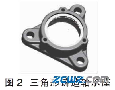 为了适应农业机械结构要求,设计采用了带座外球面轴承类型,它是由外球面球轴承和一个轴承座组成,该种轴承的外圈具有球面外径,与轴承座的凹球面内孔相配合,具有自动调心功能,适用于刚性差、扰度较大的通轴。轴承座设计为三角形铸造轴承座(图2),轴承选用具有自动调心、安装方便、密封结构完善的AEL系列带偏心套外球面球轴承,此类轴承主要特点为轴承上一端有一定的偏心度,并有同样偏心度的偏心套与其配合。