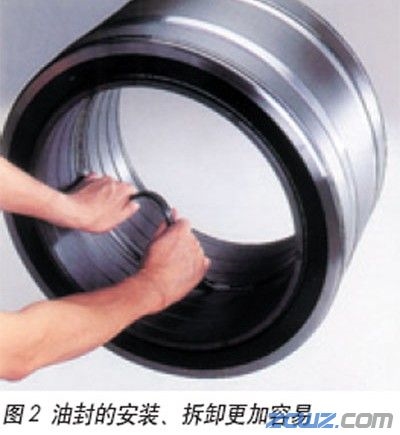 轴承的油封相对轴承的使用寿命要短,因此在轴承进行分解拆洗时,常常要对轴承的油封进行更换。油封更换的容易程度直接影响着更换油封是否会对轴承造成损害。NSK四列圆锥滚子的新油封及中间油封的设计,使得更换时不需要铆接加固,更换非常容易,有效避免了更换油封时对轴承造成的意外伤害,延长了轴承的使用寿命。此设计已申请了专利,见图2。