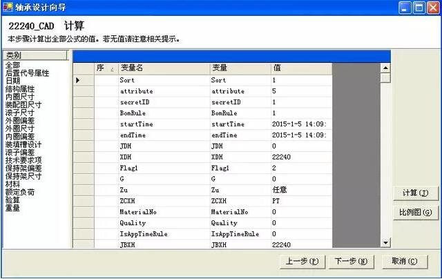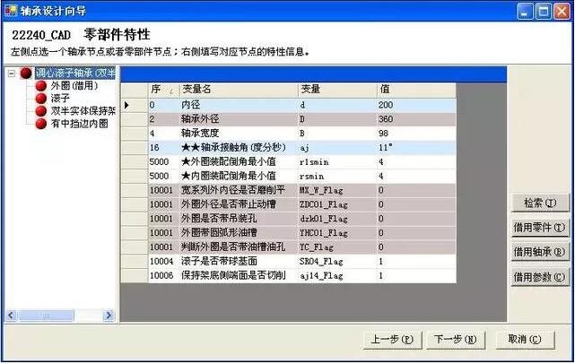 系统根据维护好的基础数据自动调用其BOM结构,通过输入某一尺寸值,点击“检索”按钮即可自动计算出其他参数数值。同时在该界面下可借用已设计完成的轴承零件和参数,实现历史知识的重用,有效提高设计效率。