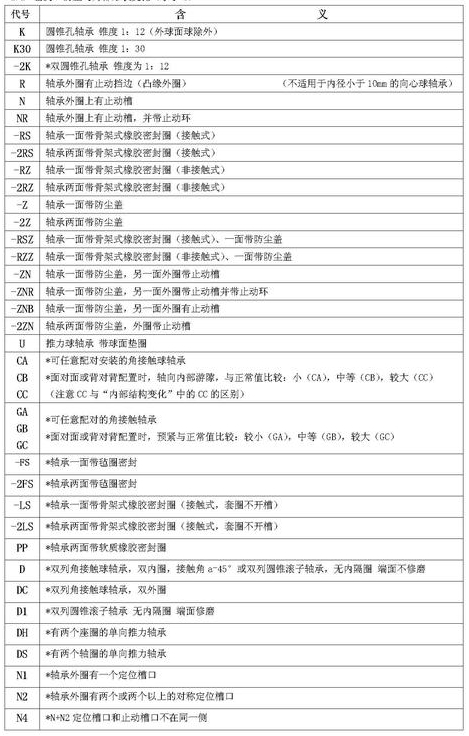新轴承代号中后置代号依次由:轴承的内部结构变化、密封防尘与外部形状变化、保持架及其材料改变、轴承材料改变、公差等级、游隙级别、配置形式等。