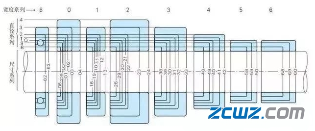 2)轴承的宽度系列(即结构、内径和直径系列都相同的轴承宽度方面的变化系列)用基本代号第3位数字表示。当宽度系列与直径系列的对比列为0系列(正常系列)时,对多数轴承在代号中可不标出宽度系列代号0,但对于调心滚子轴承和圆锥滚子轴承,宽度系列代号0应标出。直径系列代号和宽度系列代号统称为尺寸系列代号。