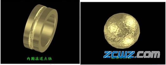 滚动体和内圈(或外圈)不断地转动,滚动体与滚道接触表面受变应力作用。当应力循环次数达到某一数值时, 在滚动体或滚道的工作面上就产生麻点和凹坑。如图所示。