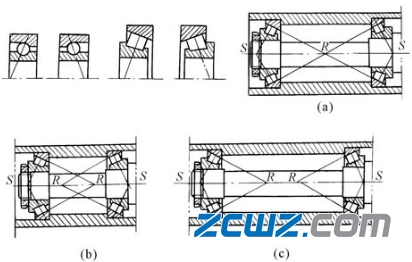 2)承受径向和轴向载荷联合作用的轴。多采用角接触型轴承面对面或者背对背排列组成两端固定支承。这种支承可通过调整某个轴承套圈的轴向定位,使轴承达到所要求的游隙或预紧量,所以特别适合与旋转精度要求高的机械。