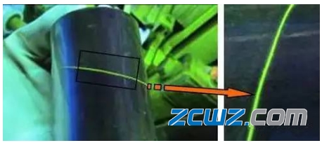最好采用荧光磁粉进行探伤,使缺陷显示更为清晰、直观。锻造折叠的磁痕一般与表面成一定角度的线状、沟状及鱼鳞片状,如图1所示。