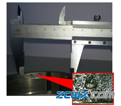 故障轴承内圈沿着径向方向有一贯穿裂纹,裂纹呈较规则形状,内圈内径、宽端面均有明显滑动痕迹(图4)。