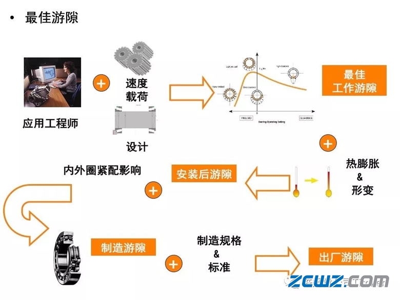 最佳工作游隙的选择是由应用工况(载荷、速度、设计参数)和期望得到的工作状态(最大寿命、最好的刚度、低的热量产生、维护的便利等等)决定的。然而,在大多数应用中,我们无法直接调整工作游隙,这就需要我们根据对应用的分析和经验,计算出相应的安装后游隙值。