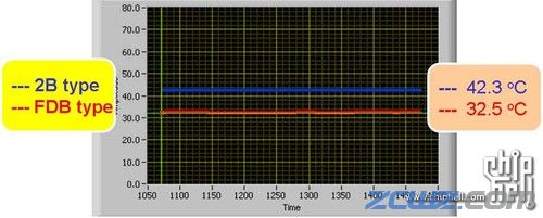 测试数据三:同规格双滚珠轴承和FDB轴承风扇在长期运转以后噪音的表现对比。