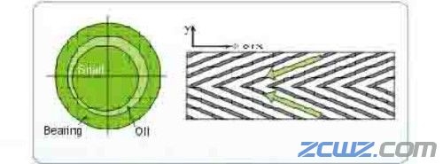 因为轴芯轴套间充满适量的液态油,而轴芯加工时刻有精密的细槽,转动启动时,压力作用把油推向细槽交汇顶点(见下图),产生更大的压力使得轴芯在转动时始终与轴套是分开的,摩擦减少后轴承的寿命就增加了。