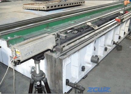 要求:当水平调试好以后,必须用激光干涉仪测量出主导轨安装基面(我们通常以靠近右侧立柱的一条导轨面为主导轨)的平面度允许每10m中凸0.05mm,全行程直线度允许中凸0.03mm。粗糙度要求1.6,外观无铸造缺陷。