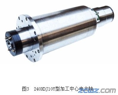 随着我国制造业的快速发展,机床市场极为火爆。从2002年起,我国已连续3年保持了世界第一机床消费大国的地位,特别是数控机床,年增长率在30%以上。高速加工中心主轴作为数控机床的核心功能部件,也得到了长足的应用和发展。由于加工中心用电主轴(图3)涉及电主轴高速旋转、润滑技术、驱动控制、准停、准速、准位等机械与电气多方面技术,因此具有较大的技术难度,目前国内高档的高速加工中心主轴多为进口国外产品。我国也非常重视加工中心电主轴的发展,国家在“九五”和“十五”中,设立了科技攻关重点项目来开发研制加工中心用内装式电主轴。目前我国已开发生产了转速从3000-120000r/min,最高转速到24000r/min,最大扭矩达到200N·m的加工中心电主轴,已经小批量装备国产机床。现在,加工中心电主轴正向低速大扭矩等方向发展,使电主轴在能够实现较高转速的同时,满足低速段有尽可能大的输出扭矩;以满足在同一台机床上进行低速重切削和高速精加工的要求。另外向快速起、停方向发展,以缩短辅助时间,提高效率。