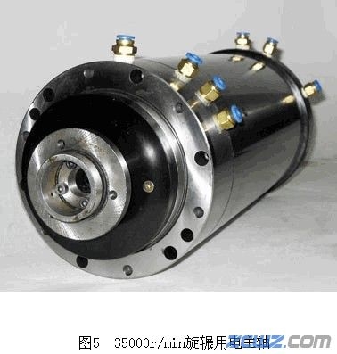 在其他制造行业,如精密铜管加工行业,高速电主轴也得到了广泛的使用。精密铜管主要是用做空调、冰箱等的热交换器,为了节省铜材和增加散热面积,铜管往往被挤压成内螺纹形,而挤压内螺纹主要依靠高速旋辗用电主轴。以前国内只有少量从日本和芬兰进口的高速旋辗用电主轴,价格非常昂贵,维护也不方便。我国从1997年开始开发生产高速旋辗用电主轴(图5),已形成了比较完整的系列,现在已经基本占领了国内精密铜管加工行业。电主轴采用陶瓷球轴承支承,采用油气润滑,其最高转速可达到40000r/min,目前国内采用的转速一般为35000r/min,而世界其他先进国家使用的转速大多停留在24000r/min,生产效率远远低于我们。我国高速旋辗用电主轴从无到有,到现在已经处于国际领先水平,我国的精密铜管加工行业也从比较落后到成为世界最大的精密铜管加工国,高速电主轴的应用和发展起到了非常重要的作用。现在,我国高速旋辗用电主轴凭借着价格低、技术先进、维护方便等优点,每年生产销售数百套,并且批量出口到国外。
