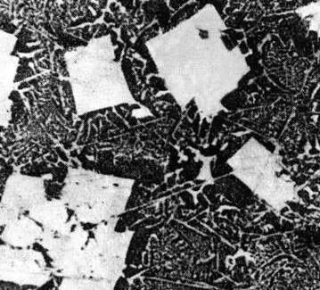 Pb-Sb二元合金相图(图2)具有共晶型转变。共晶成分中WSb为11.2%。图中Sb含量在17.5%~20%间为合金的室温组织,由初生β相硬质点和(α+β)共晶软基体组成。但是由于二元Pb-Sb合金同样有严重偏析,而且β相很脆,易破碎,基体又太软,易磨损,因此Pb-Sb合金还加入Cu、Sn等其他元素。加Cu可形成Cu3Sn,防止比重偏析,还可形成Cu2Sb硬质点,提高合金耐磨性。加Sn能形成金属化合物SnSb硬质点,它能大量溶解于铅中而强化基体,故可提高合金的强度和耐磨性。ZPbSb16Sn16Cu2是工业中最常用的铅基轴承合金,其WSb=16%、WSn=16%、WCu=2%,属于过共晶合金。其组织中的(α+β)共晶体是软基体,白色方块为化合物SnSb,白色针状晶体是化合物Cu3Sn。初生的β化合物Cu2Sn、SnSb是合金中的硬质点(见图3)。