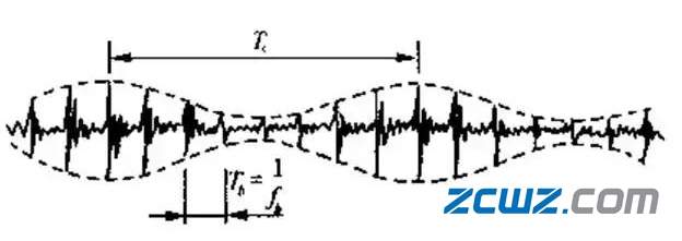 若载荷的作用方向不变,当滚动轴承内圈转动时,则损伤点和载荷的相对位置关系呈周期变化。每次碰撞有不同的强度,振动幅值发生周期性的强弱变化,呈现调幅现象,周期取决于内圈的转频,图3所示。