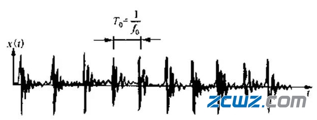 若载荷的作用方向不变,当滚动体上有损伤点时,则发生的振动如图4所示,这种情况和内圈有损伤点相似,振动幅值呈周期性强弱变化,周期取决于滚动体的公转频率。