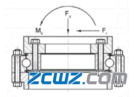 转台轴承可用于承受单向或者贯穿旋转轴的多方向载荷。所有这些载荷可以被分解为四种,作用于轴承中心,或者作用在轴承中心周围的,被称为径向载荷、轴向载荷、力矩和转矩。这些参数用来校核轴承和所包含的齿轮的尺寸和承载能力。其中的三种载荷在图4中有明确的表述。第四种,也就是转矩,是指轴承的一个圈相对于另一个圈旋转的倾向。