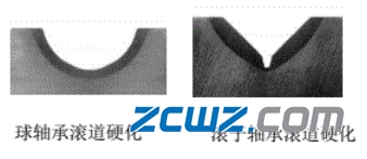 轴承由一个内圈和一个外圈组成,材质一般是渗碳钢。每个圈至少包括一个精密滚道,用以传递负载并实现设备两部分的相对转动。对滚道表面及一定深度进行有选择的硬化,可以更好的分散传递设备运行中产生的高应力。图2展示了四点接触球(RK、HS、HT、MT、KH和XT系列)和交叉滚子(XR系列)轴承的典型硬化方式。多列轴承(DT和TR系列)高应力滚道的处理方法和上述系列类似。在滚道附近的某个位置,会有非硬化区域,它被称为硬化间隙或者“软肋”。这个区域可以分担应力,使得滚动体性能不会受到损害。每个轴承圈只有一侧与支撑结构相连接。一个或者两个圈都有完整的传动结构,例如齿轮或者链轮齿轮,这样可以利用这些传动方式的优良特性,克服旋转阻力,使轴承内外圈相对旋转。