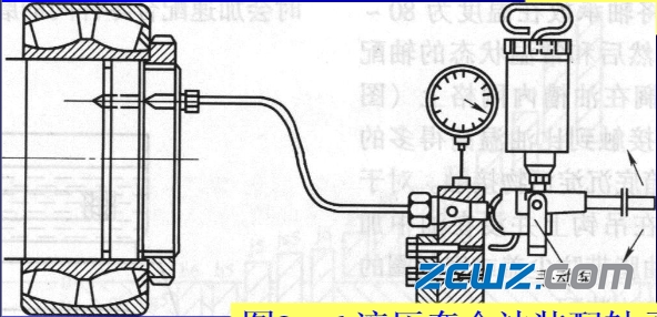 (2)圆锥孔轴承的装配过盈量较小时可直接装在有锥度的轴颈上,也可以装在紧定套或退卸套的锥面上(图4); 对于轴颈尺寸较大或配合过盈量较大而又经常拆卸的圆锥孔轴承,常用液压套合法拆卸(图5)。