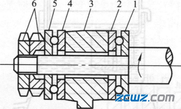 (3)推力球轴承的装配推力球轴承有松圈和紧圈之分,装配时应使紧圈靠在转动零件的端面上,松圈靠在静止零件的端面。上(图6),否则会使滚动体丧失作用,同时会加速配合零件间的磨损。