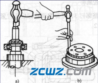 图1 锤击法装配滚动轴承(a用特制套压入;b用铜棒敲入)